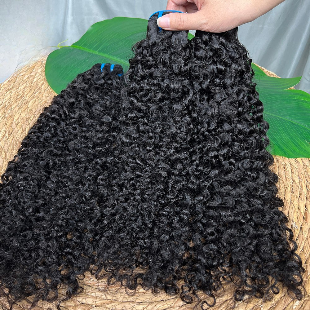 Notre tissage Afro Curly en Virgin Hair 100 % cheveux naturels reproduit de belles boucles serrées, denses, parfaites pour les femmes qui assument leur texture et aiment les looks full volume.